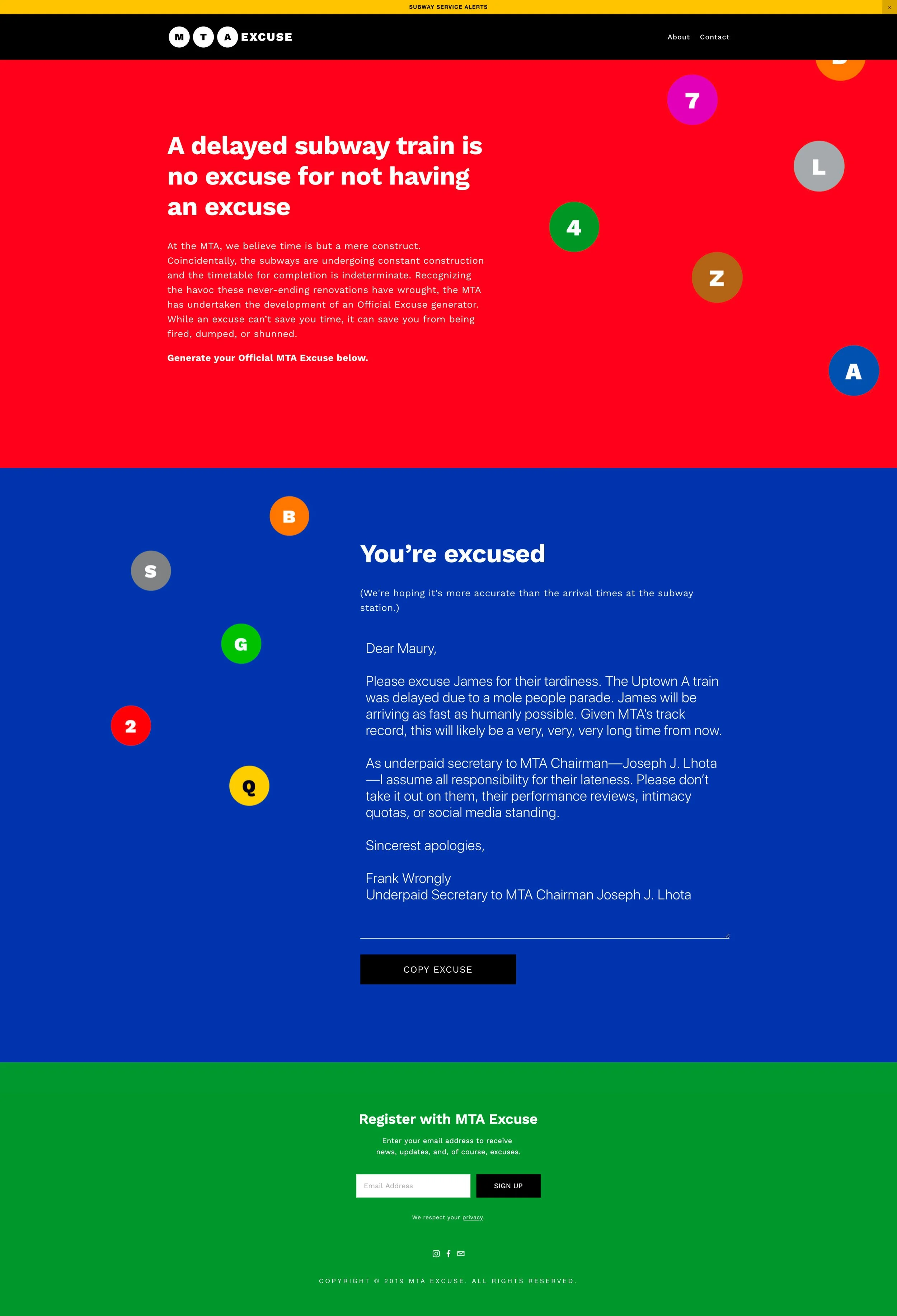 The NYC Subway system is a mess, causing all kinds of delays. So, my friend and I thought, the least the MTA could do was to provide an Official Late Excuse™. While an excuse can’t save you time, it can save you from being fired, dumped, or shunned.
